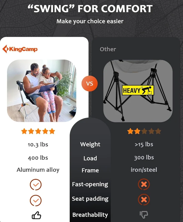 आउटडोर कैंपिंग चेयर 37.8 "x27.1" x49.2 "है, आपके पास अप्रतिबंधित के चारों ओर घूमने के लिए कमरे की सीट क्षेत्र है, और उच्च बैकरेस्ट पूरी तरह से आपकी पीठ का समर्थन कर सकता है। 22.8" जमीन से दूर, रॉकिंग कैंप की कुर्सी वयस्कों के लिए एकदम सही है। पैर स्वतंत्र रूप से।