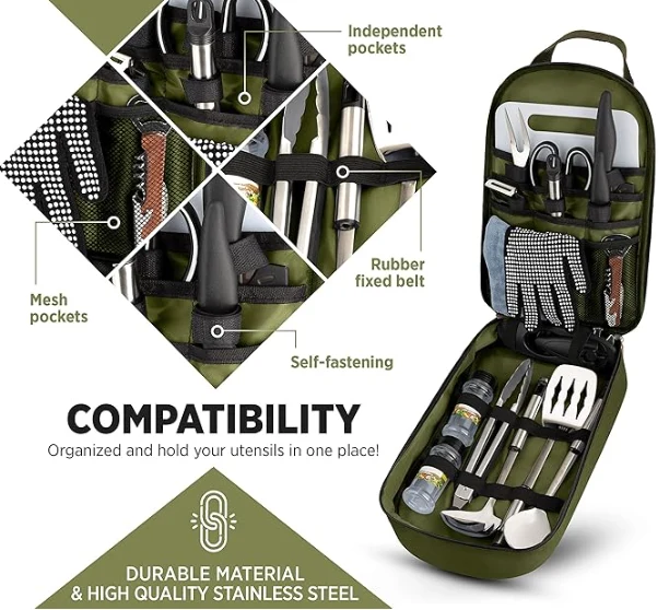 पोर्टेबल आउटडोर कैंपिंग टूल बैग, प्रत्येक बर्तन का अपना नामित थैली है, इसलिए इकाइयां स्टोरेज में या पारगमन में धब्बा, खरोंच या क्षतिग्रस्त नहीं होती हैं। आपके खाना पकाने के बर्तन तक आसान पहुंच प्रदान करता है और यह एक सुरक्षित ज़िप सील से सुसज्जित है