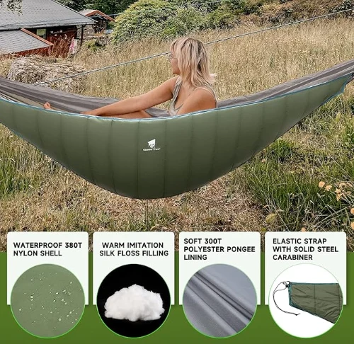 यात्रा शिविर झूला, एक स्लीपिंग बैग के आराम और एक झूला के इन्सुलेट को मिलाएं, किसी भी मानक आकार के झूला के साथ फिट करना आसान बनाते हैं, आपको ठंड के मौसम में गर्म रखते हैं। यह शिविर, बैकपैकिंग, शिकार, बाहरी गतिविधियों, पर्वतारोहण के लिए एकदम सही है